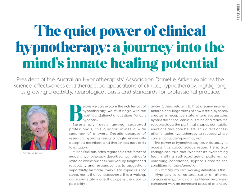 Ref: Aitken, D. (2025). The quiet power of clinical hypnotherapy: A journey into the mind’s innate healing potential. Massage & Myotherapy Australia Journal, (3), 11–12